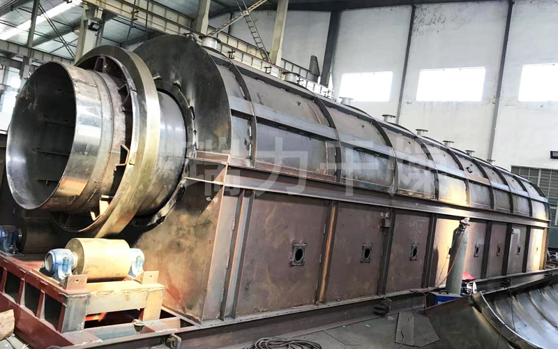 先通過(guò)天然氣燃燒器在燃燒室燃燒,將旋轉(zhuǎn)的回轉(zhuǎn)滾筒筒體加熱均勻。物料通過(guò)定量加料器將物料送入回轉(zhuǎn)滾筒內(nèi)部,通過(guò)筒體的旋轉(zhuǎn)和筒體的傾斜度,使物料不斷地向前移動(dòng)。在移動(dòng)的過(guò)程中,加熱后的筒體將熱量傳遞給物料,使物料溫度上升,產(chǎn)品得到煅燒,煅燒后的產(chǎn)品成高溫狀態(tài)從尾端排出.高溫間接煅燒窯,它包括主傳動(dòng)裝置、窯體和與其下部相接的燃燒系統(tǒng),窯體由前至后依次設(shè)有喂料與攪拌機(jī)構(gòu)、料斗、回轉(zhuǎn)窯筒體與尾罩;其中,回轉(zhuǎn)窯筒體通設(shè)于所述窯體且延伸出該窯體兩端,回轉(zhuǎn)窯筒體的進(jìn)口端與所述料斗出口端相接,回轉(zhuǎn)窯筒體的出口端與尾罩相接,主傳動(dòng)裝置設(shè)置于該回轉(zhuǎn)窯筒體的前端或后端。