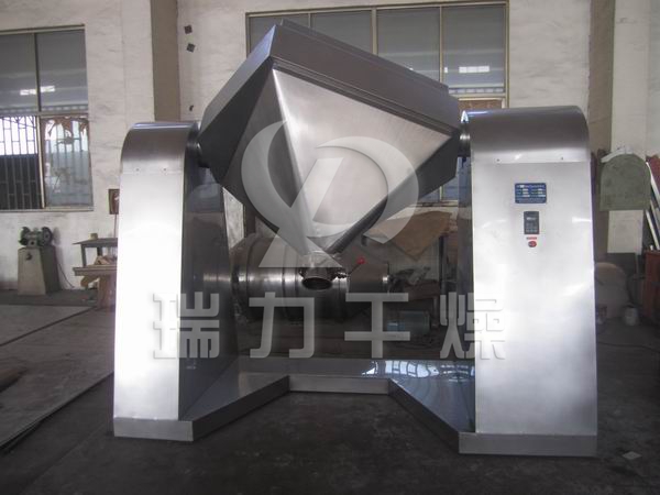 將物料裝入方錐形密閉混合桶內(nèi),料斗對稱的軸線與回轉(zhuǎn)軸軸線成一夾角,不同組分物料在密閉的料斗中進行三維空間運動,產(chǎn)生強烈翻轉(zhuǎn)和擴散收縮作用,達到好的混合效果。