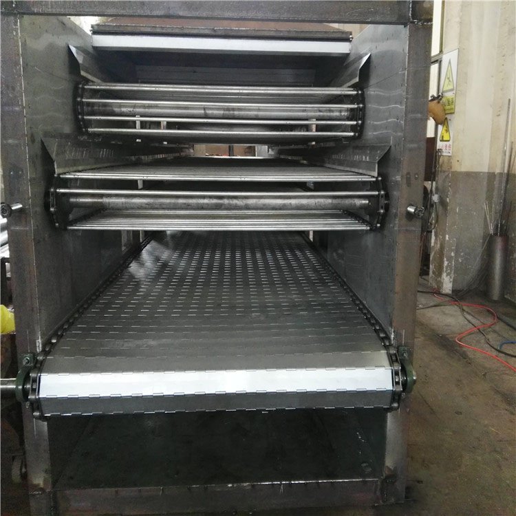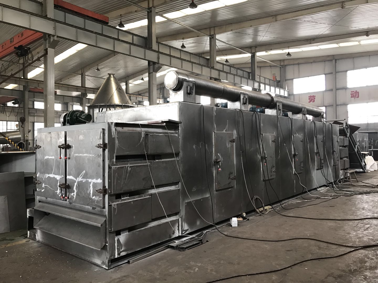 物料由加料器均勻地鋪在網(wǎng)帶上,網(wǎng)帶一般采用12-60目不銹鋼絲網(wǎng),由傳動(dòng)裝置拖動(dòng)在干燥機(jī)內(nèi)移動(dòng)。干燥機(jī)由若干單元組成,每一單元熱風(fēng)獨(dú)立循環(huán),部分尾氣由專門排濕風(fēng)機(jī)排出,廢氣由調(diào)節(jié)閥控制,熱氣由下往上或由上往下穿過鋪滿物料的網(wǎng)帶完成熱量與質(zhì)量傳遞的進(jìn)程,帶走物料水份。網(wǎng)帶緩慢移動(dòng),運(yùn)行速度可根據(jù)物料溫度自由調(diào)節(jié),干燥后的成品連續(xù)落入收料器中。上下循環(huán)單元根據(jù)用戶需要可靈活配備,單元數(shù)量亦可根據(jù)需要選取。