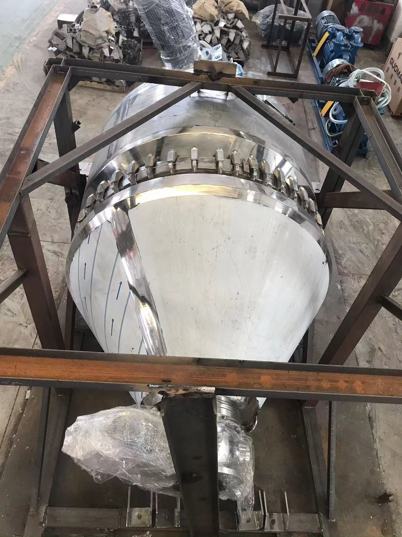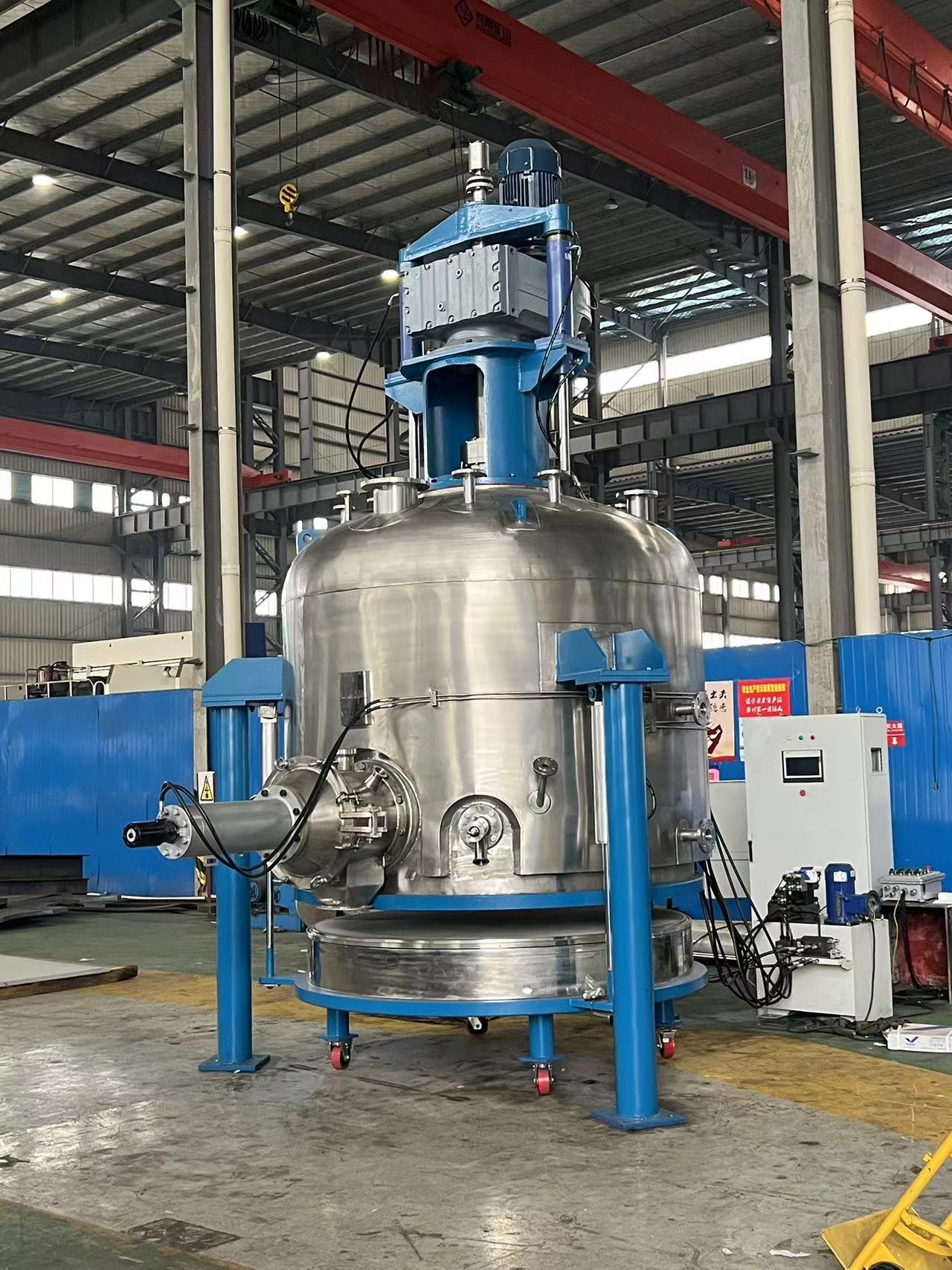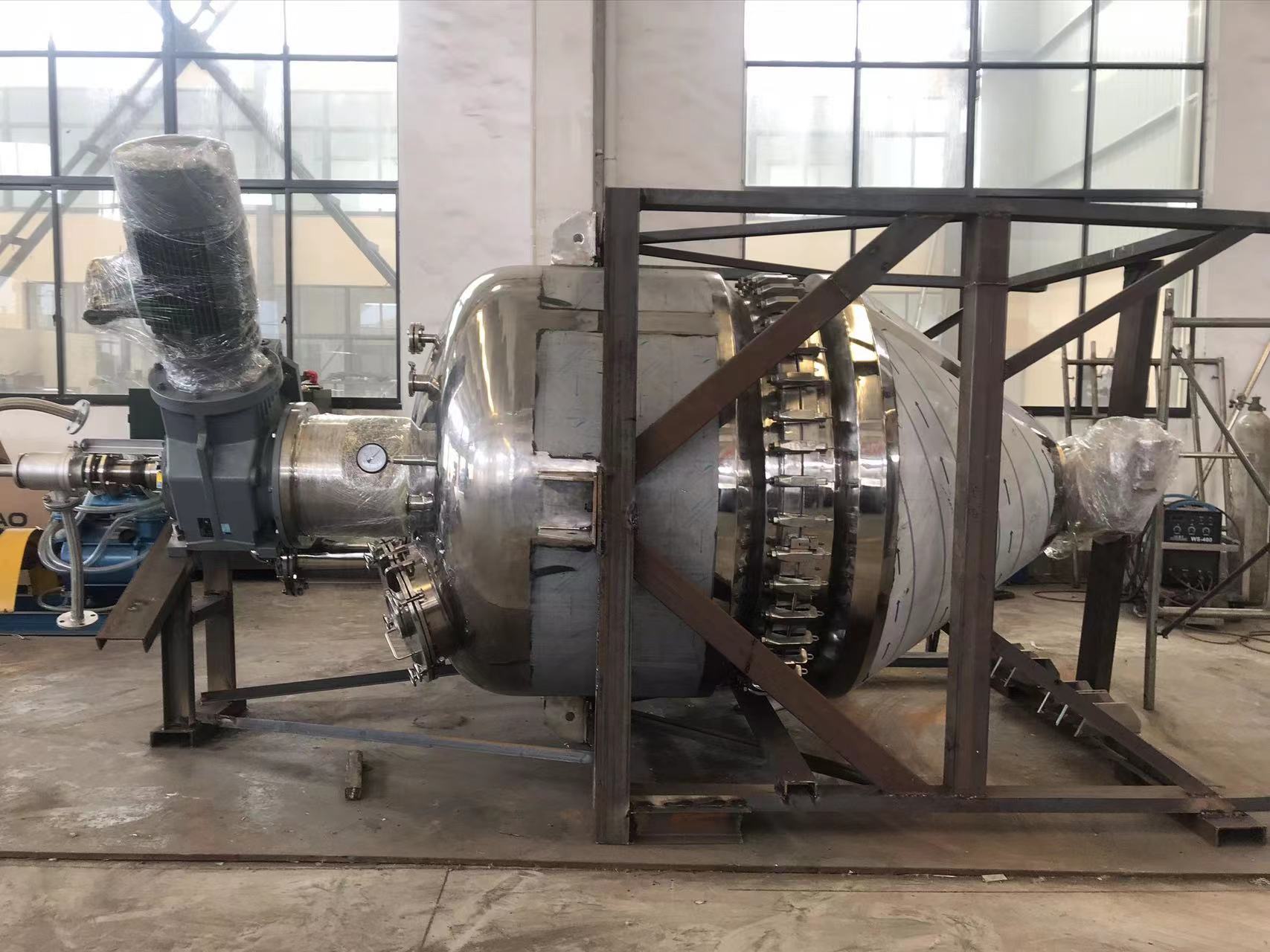 三合一真空干燥機(jī)主要由驅(qū)動(dòng)系統(tǒng)、電機(jī)減速機(jī)、機(jī)架、軸承、錐形筒體(帶有夾套)、攪拌螺帶、取樣閥、填料密封等部件組成。設(shè)備采用電機(jī)減速機(jī)與攪拌螺帶直連的方式,變頻調(diào)速,轉(zhuǎn)速0~20rpm,螺帶與攪拌軸在特定胎具中進(jìn)行焊接,使得螺帶與桶壁的間隙均勻,確保了運(yùn)轉(zhuǎn)過(guò)程的穩(wěn)定性;在攪拌軸和封頭之間采用柔性石墨填料密封,有效的防止了外界雜質(zhì)的進(jìn)入。錐形筒體和橢圓封頭都帶有夾套,可通入不同種類的熱介質(zhì)并能承受一定壓力,在攪拌混合的同時(shí)進(jìn)行加熱,實(shí)現(xiàn)物料的干燥目的,干燥效果較好,運(yùn)行穩(wěn)定。