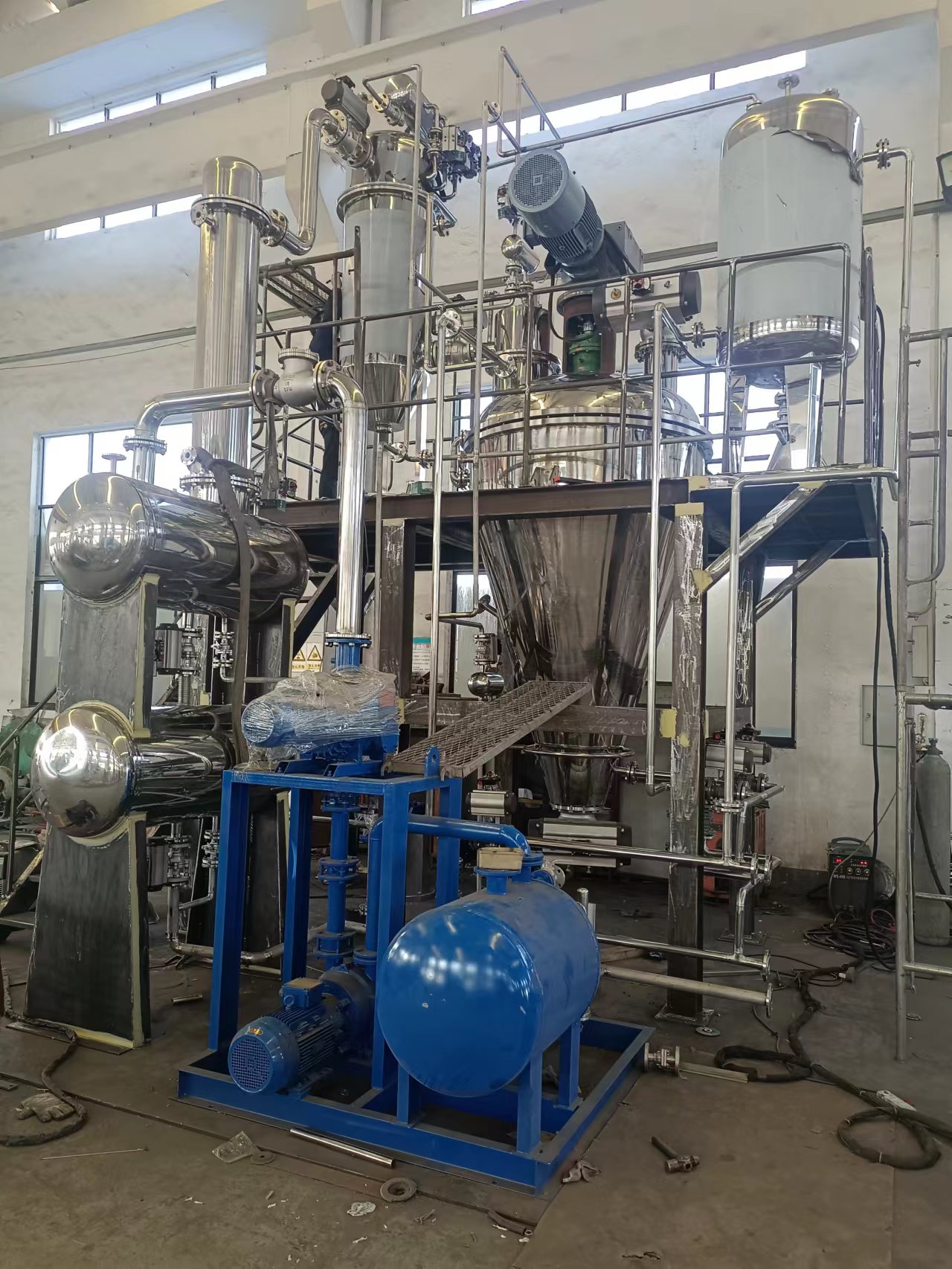 產(chǎn)品描述:三合一真空干燥機(jī)主要由驅(qū)動(dòng)系統(tǒng)、電機(jī)減速機(jī)、機(jī)架、軸承、錐形筒體(帶有夾套)、攪拌螺帶、取樣閥、填料密封等部件組成。