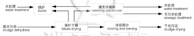 (2)熱源產(chǎn)生。可使用熱蒸汽或熱油作為熱交換的熱源。一般熱流體的溫度為180℃-200℃。熱介質(zhì)分別被引入中空的干燥機殼體和轉(zhuǎn)動的軸槳葉等所有與污泥接觸進行熱交換的加熱金屬表面。