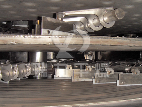 濕物料自加料器連續(xù)地加到干燥器上部第一層干燥盤上,帶有耙葉的耙臂作回轉(zhuǎn)運(yùn)動使耙臂作回轉(zhuǎn)運(yùn)動使耙葉連續(xù)地翻抄物料。物料沿指數(shù)螺旋線流過干燥盤表面,在小干燥盤上的物料被移送到外緣,并在外緣落到下方的大干燥盤外緣,在大干盤上物料向里移動并從中間落料口落如下一層小干燥盤中。大小干燥盤上下交替排列,物料得以連續(xù)地流過整個干燥器。中空的干燥盤內(nèi)通入加熱介質(zhì),加熱介質(zhì)形式有飽和蒸汽、熱水和導(dǎo)熱油,加熱介質(zhì)由干燥盤的一端進(jìn)入,從另一端導(dǎo)出。已干物料從最后一層干燥盤落到殼體的底層,最后被耙葉移送到出料口排出。濕份從物料中逸出,由設(shè)在頂蓋上的排濕口排出,真空型盤式干燥器的濕氣由設(shè)在頂蓋上的真空泵口排出。從底層排出的干物料可直接包裝。通過配加翅片加熱器、溶劑回收冷凝器、袋式除塵器、干料返混機(jī)構(gòu)、引風(fēng)機(jī)等輔機(jī),可提高其干燥的生產(chǎn)能力,干燥膏糊狀和熱敏性物 料,可方便地回收溶劑,并能進(jìn)行熱解和反應(yīng)操作。