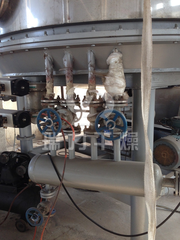 物料進(jìn)入加料斗1內(nèi),氣動(dòng)球閥a與d同時(shí)打開(kāi),加料斗1內(nèi)的物料進(jìn)入進(jìn)料過(guò)渡料倉(cāng)1內(nèi),同時(shí)進(jìn)料過(guò)渡料倉(cāng)2內(nèi)的物料在攪拌裝置的作用下進(jìn)入干燥機(jī)內(nèi),氣動(dòng)球閥a與d同時(shí)關(guān)閉,氣動(dòng)球閥b與c同時(shí)打開(kāi),加料斗2內(nèi)的物料進(jìn)入進(jìn)料過(guò)渡料倉(cāng)2內(nèi),同時(shí)進(jìn)料過(guò)渡料倉(cāng)1內(nèi)的物料在攪拌裝置的作用下進(jìn)入干燥機(jī)內(nèi),如此反復(fù),濕物料連續(xù)進(jìn)入干燥機(jī)內(nèi)頂部干燥盤(pán)上。 干燥完的物料在耙刀作用下進(jìn)入氣動(dòng)球閥e的進(jìn)口,氣動(dòng)球閥e與h同時(shí)打開(kāi),干物料進(jìn)入出料過(guò)渡料倉(cāng)1內(nèi),出料過(guò)渡料倉(cāng)2內(nèi)的物料通過(guò)氣動(dòng)球閥h出到干燥機(jī)外,同樣,干燥完的物料在耙刀作用下進(jìn)入氣動(dòng)球閥g的進(jìn)口,氣動(dòng)球閥g與f同時(shí)打開(kāi),干物料進(jìn)入出料過(guò)渡料倉(cāng)2內(nèi),出料過(guò)渡料倉(cāng)1內(nèi)的物料通過(guò)氣動(dòng)球閥h出到干燥機(jī)外,如此反復(fù),干物料連續(xù)出到干燥機(jī)外包裝。