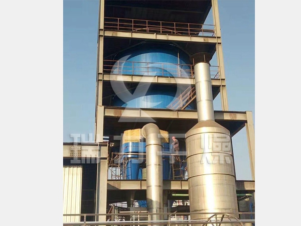 本機(jī)組工作過程為:料液通過隔膜泵高壓輸入,噴出霧狀液滴,然后同熱空氣并流下降,大部分粉粒由塔底排料口收集,廢氣及其微小粉末經(jīng)旋風(fēng)分離器分離,廢氣由抽風(fēng)機(jī)排出,粉末由設(shè)在旋風(fēng)分離器下的收粉筒收集,風(fēng)機(jī)出口處還可裝備二級(jí)除塵裝置,回收率在96%-98%。