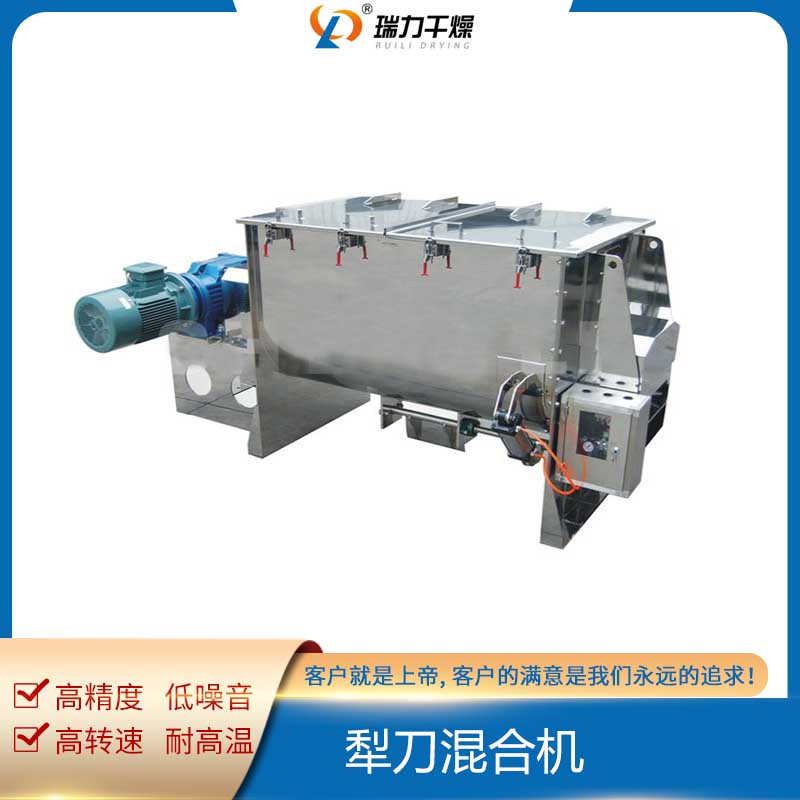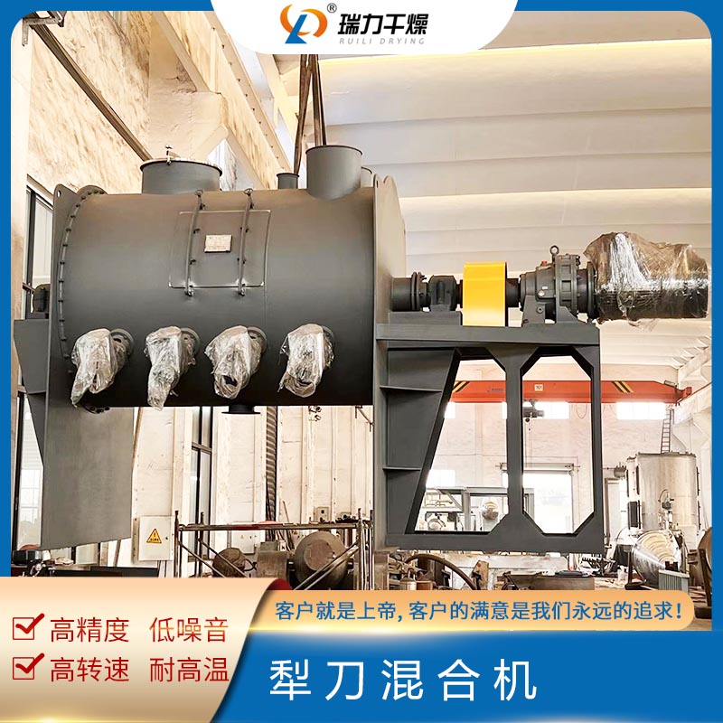 犁刀混合機(jī)設(shè)備結(jié)構(gòu)主要由傳動(dòng)部分、臥式筒體、犁刀組軸、飛刀組、出料閥、噴液裝置等組成,臥式筒體內(nèi)的犁刀隨主軸旋轉(zhuǎn)使物料沿筒臂作徑向圓周湍動(dòng),同時(shí)徑向物料沿線流經(jīng)飛刀組,被高速旋轉(zhuǎn)的飛刀拋散,不斷更迭、復(fù)合,使物料在短的時(shí)間達(dá)到混合均勻;傳動(dòng)部分包括帶電機(jī)擺線針輪減速機(jī)、聯(lián)軸器,主要把電機(jī)的運(yùn)動(dòng)變?yōu)樾枰乃俣群团ぞ貍鹘o復(fù)雜刀軸。