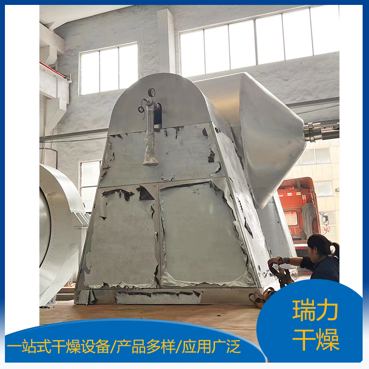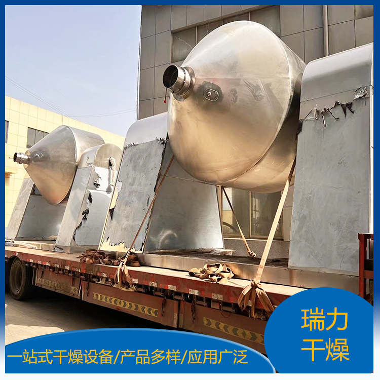 雙錐回轉(zhuǎn)真空干燥機(jī)為雙錐形的回轉(zhuǎn)罐體,罐內(nèi)在真空狀態(tài)下,向夾套內(nèi)通入蒸汽或熱水進(jìn)行加熱,熱量通過(guò)罐體內(nèi)壁與濕物料接觸,濕物料吸熱后蒸發(fā)的水汽,通過(guò)真空泵經(jīng)真空排氣管被抽走。由于罐體內(nèi)處于真空狀態(tài),且罐體的回轉(zhuǎn)使物料不斷的上下內(nèi)外翻動(dòng),故加快了物料的干燥速度,提高干燥效率,達(dá)到均勻干燥的目的。雙錐回轉(zhuǎn)真空干燥機(jī)系統(tǒng)主要由雙錐回轉(zhuǎn)真空干燥機(jī)、冷凝器、除塵器、真空抽氣系統(tǒng)、加熱系統(tǒng)、冷卻系統(tǒng)、電控系統(tǒng)等組成。